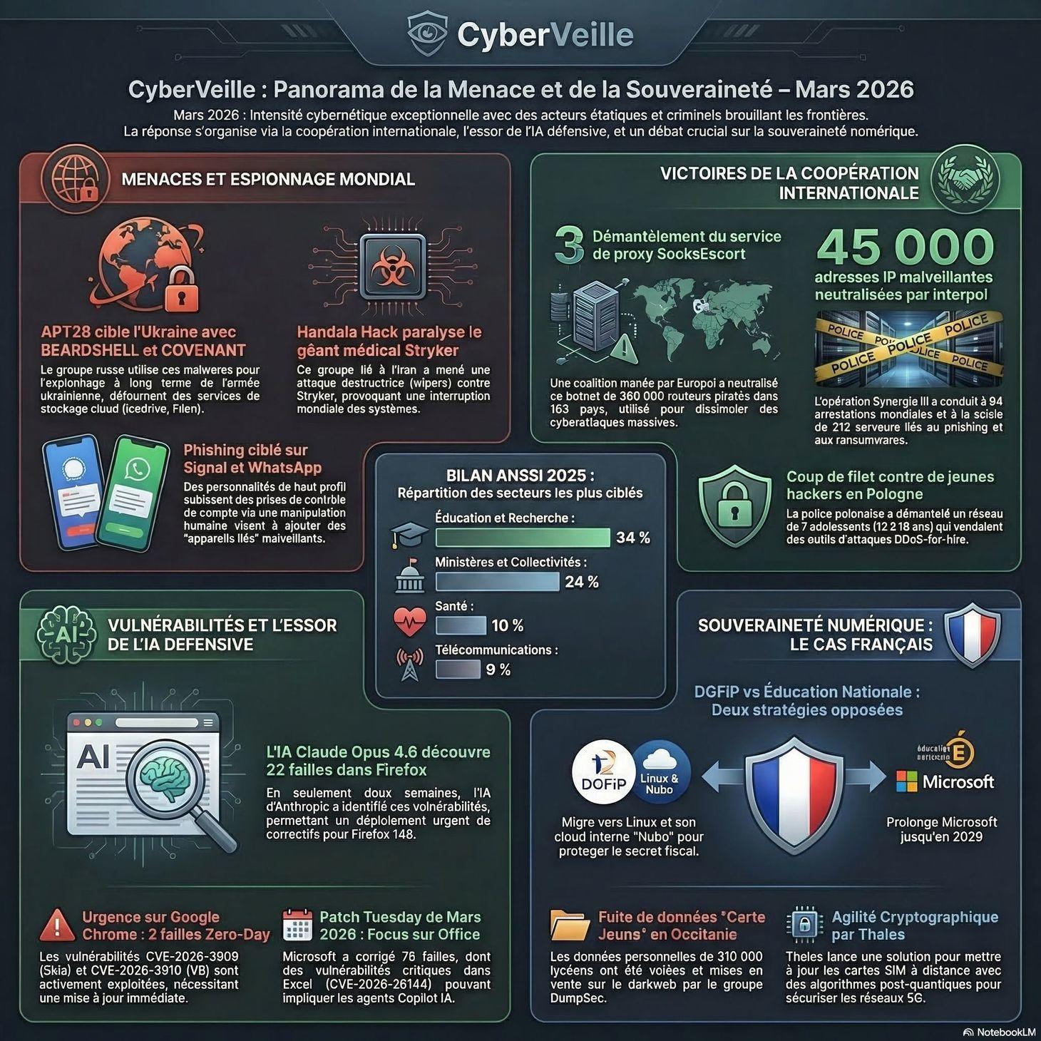 📌 ANSSI (France) : Bilan 2025 avec 3 586 événements traités (baisse de 18 % par rapport à 2024), secteurs les plus ciblés : éducation, santé, collectivités, télécoms.